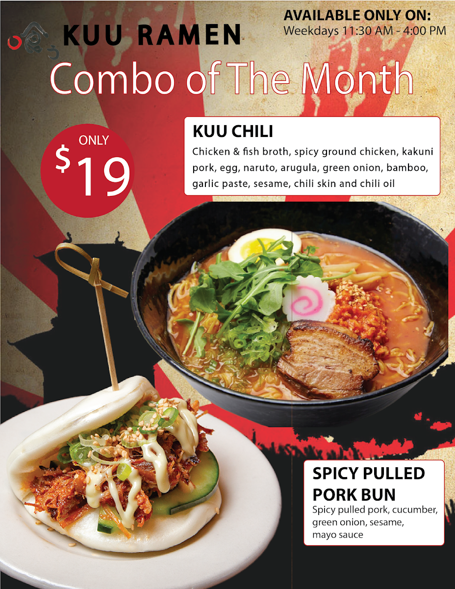 11-hour pork broth, special Kuu wavy noodles, spicy pulled pork, scallion, garlic chip, naruto, egg, and sesame.